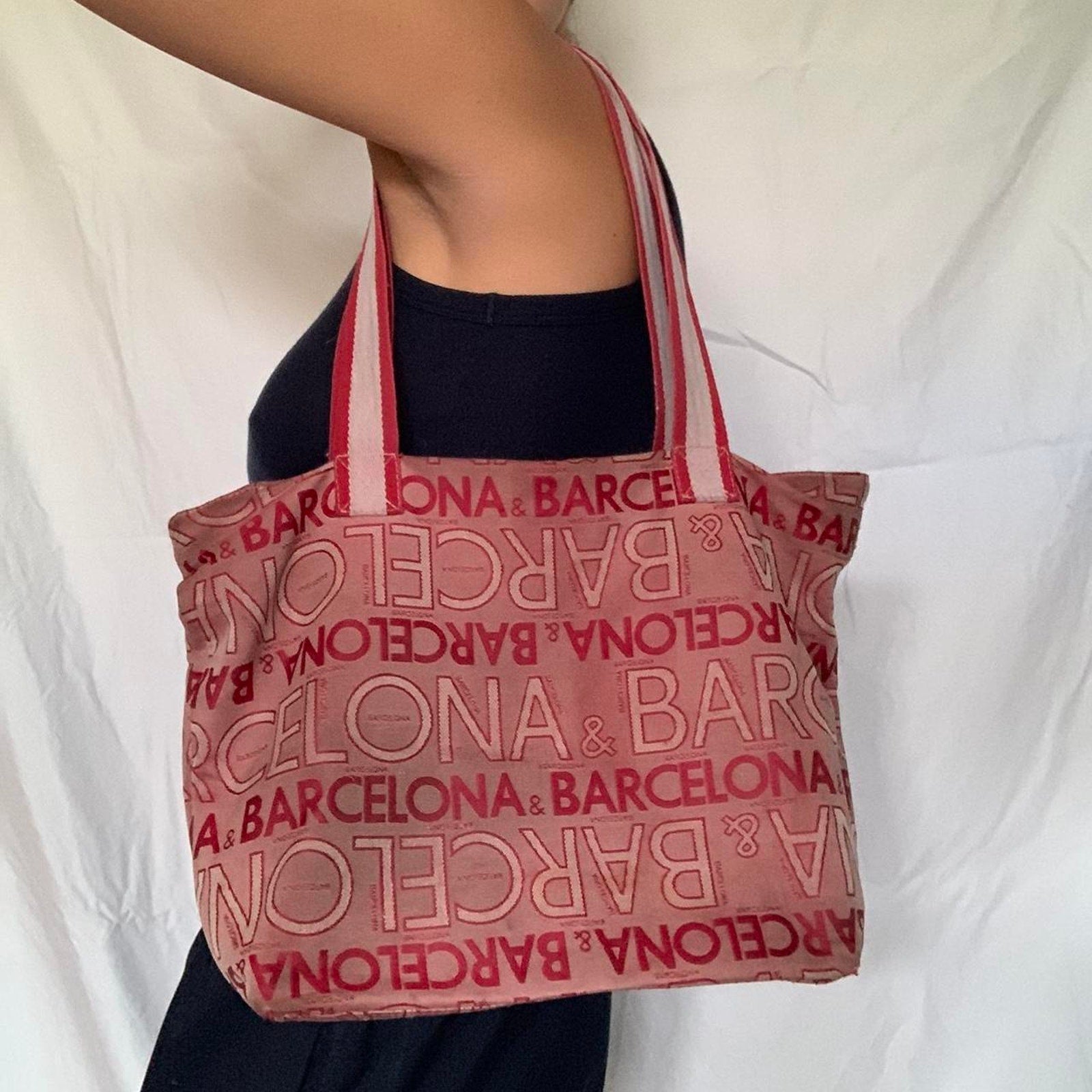 Unbranded, large tote with zipper closure. Barcelona text print pattern.