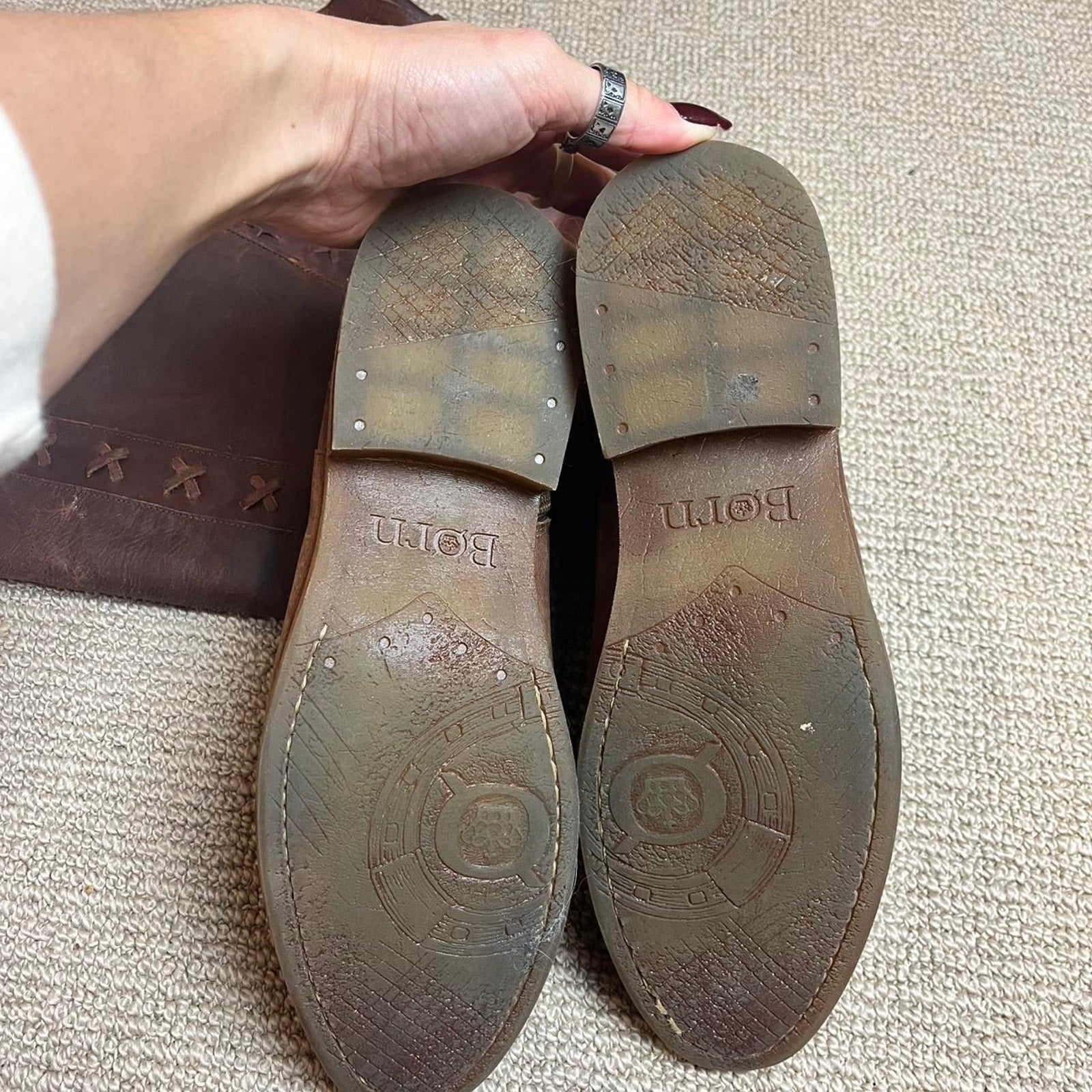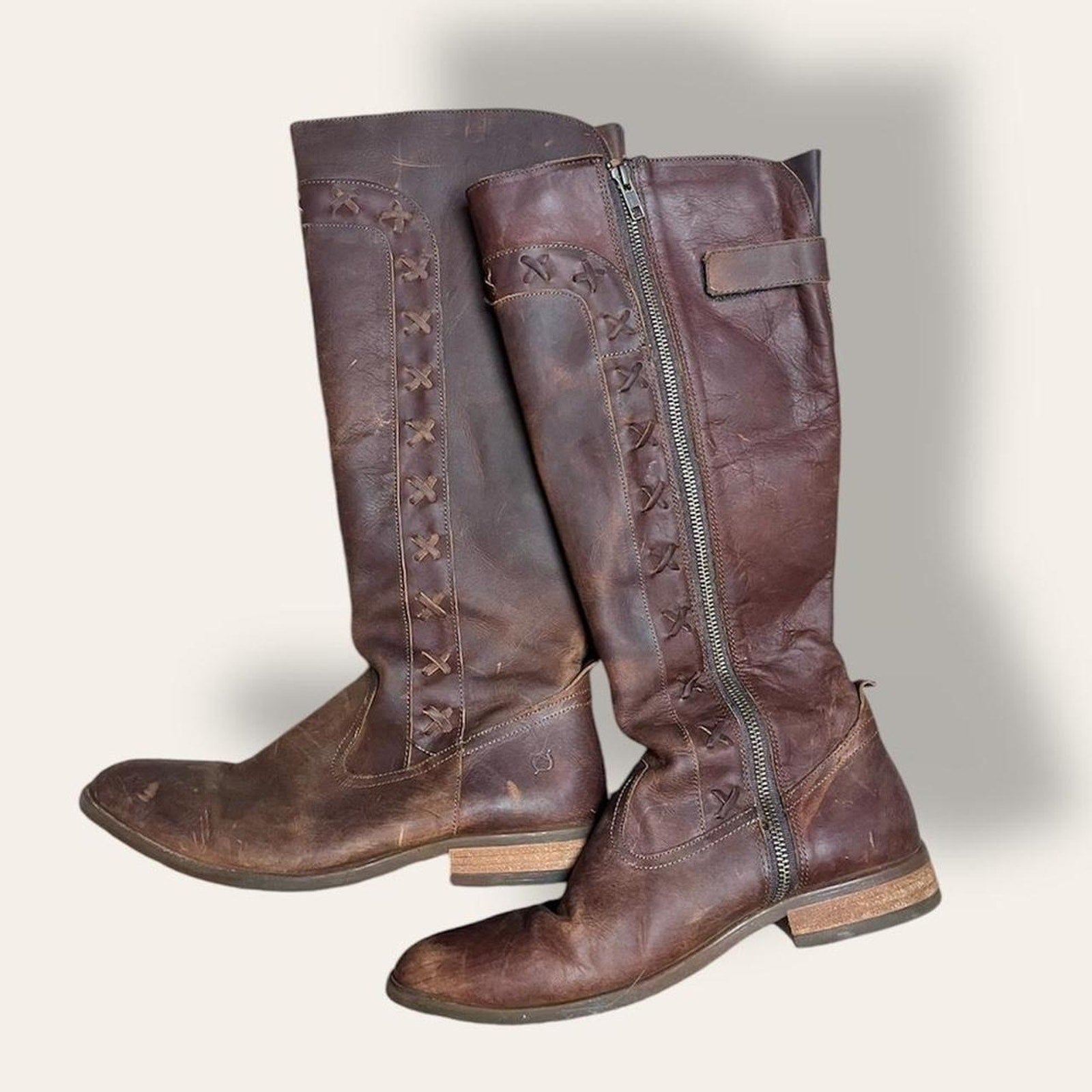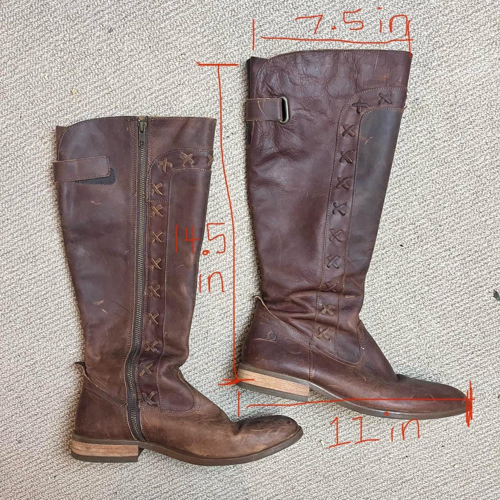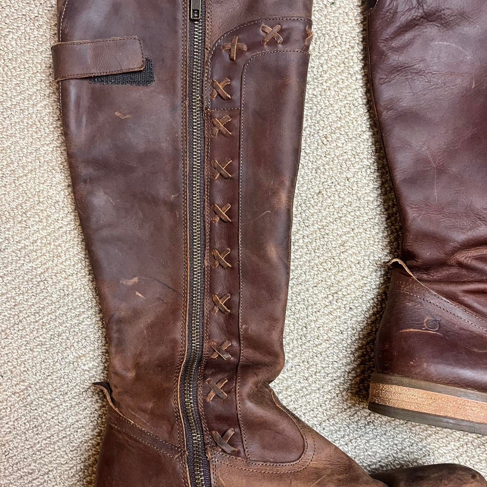 ✭ Brown leather knee high boots. Lace up detail and zipper closure. Small heel and slight pointed toe.