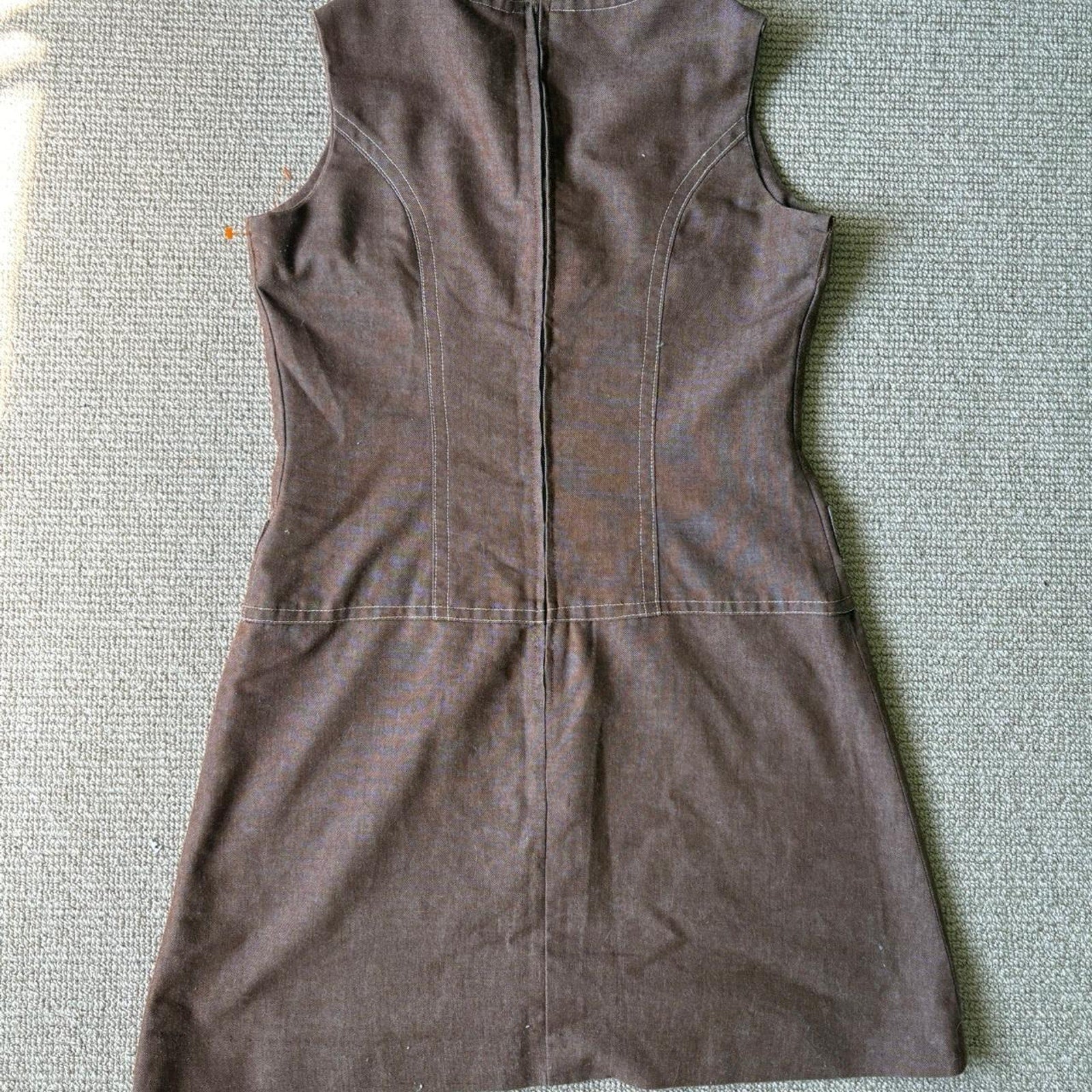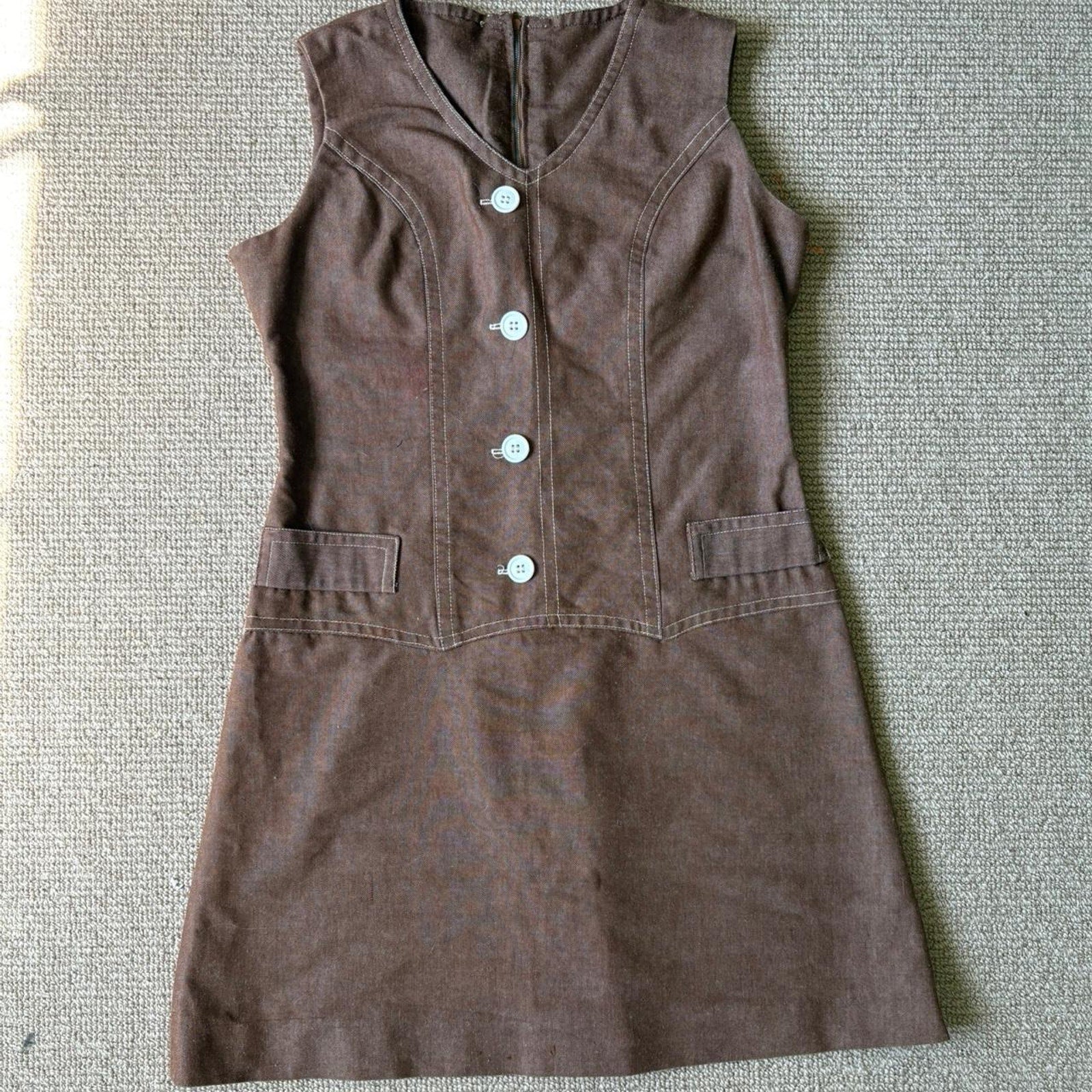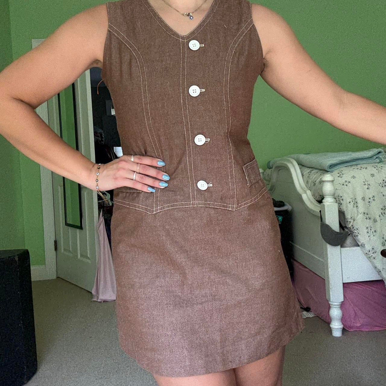 ā Brown denim mod style fit mini dress. Vest style top with white buttons and contrast stitching details.