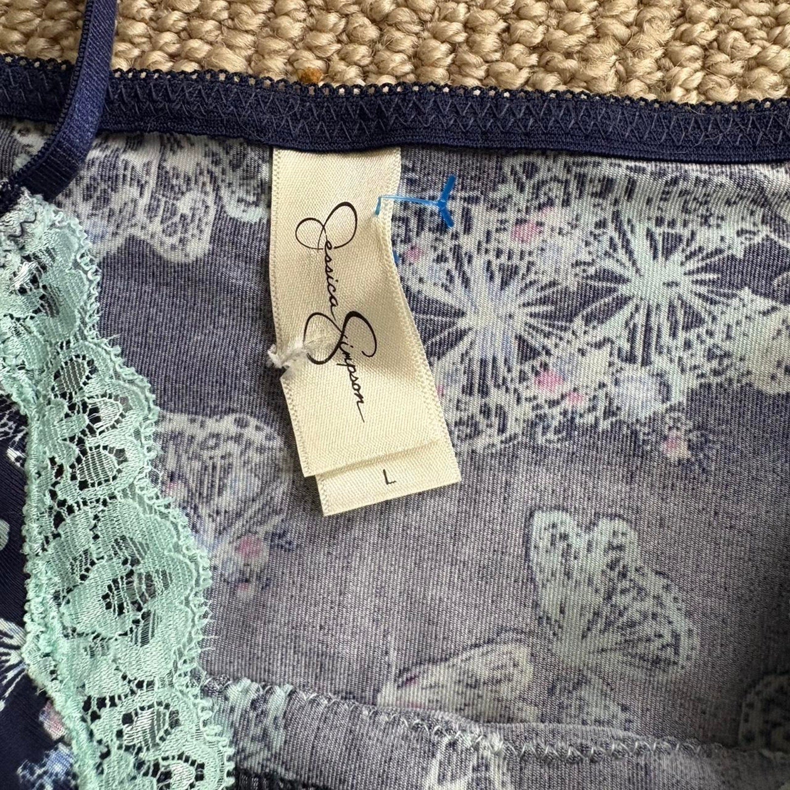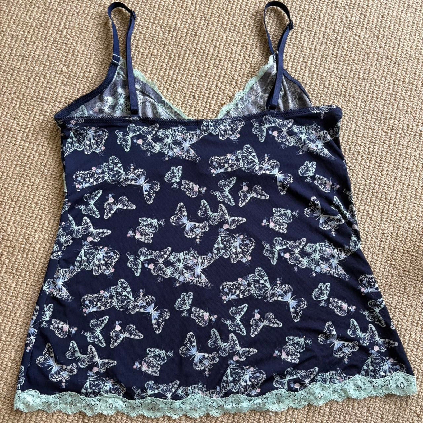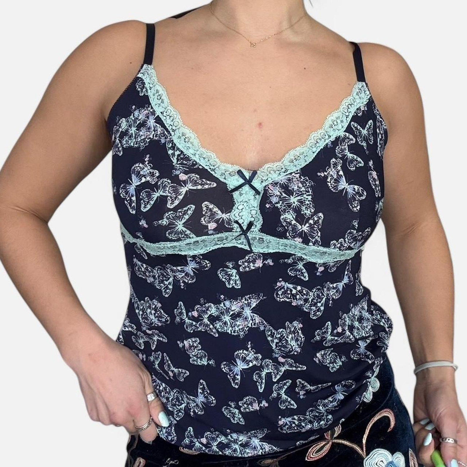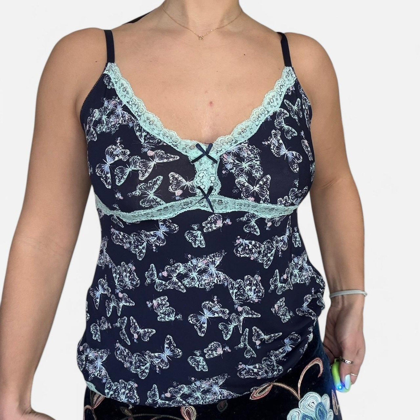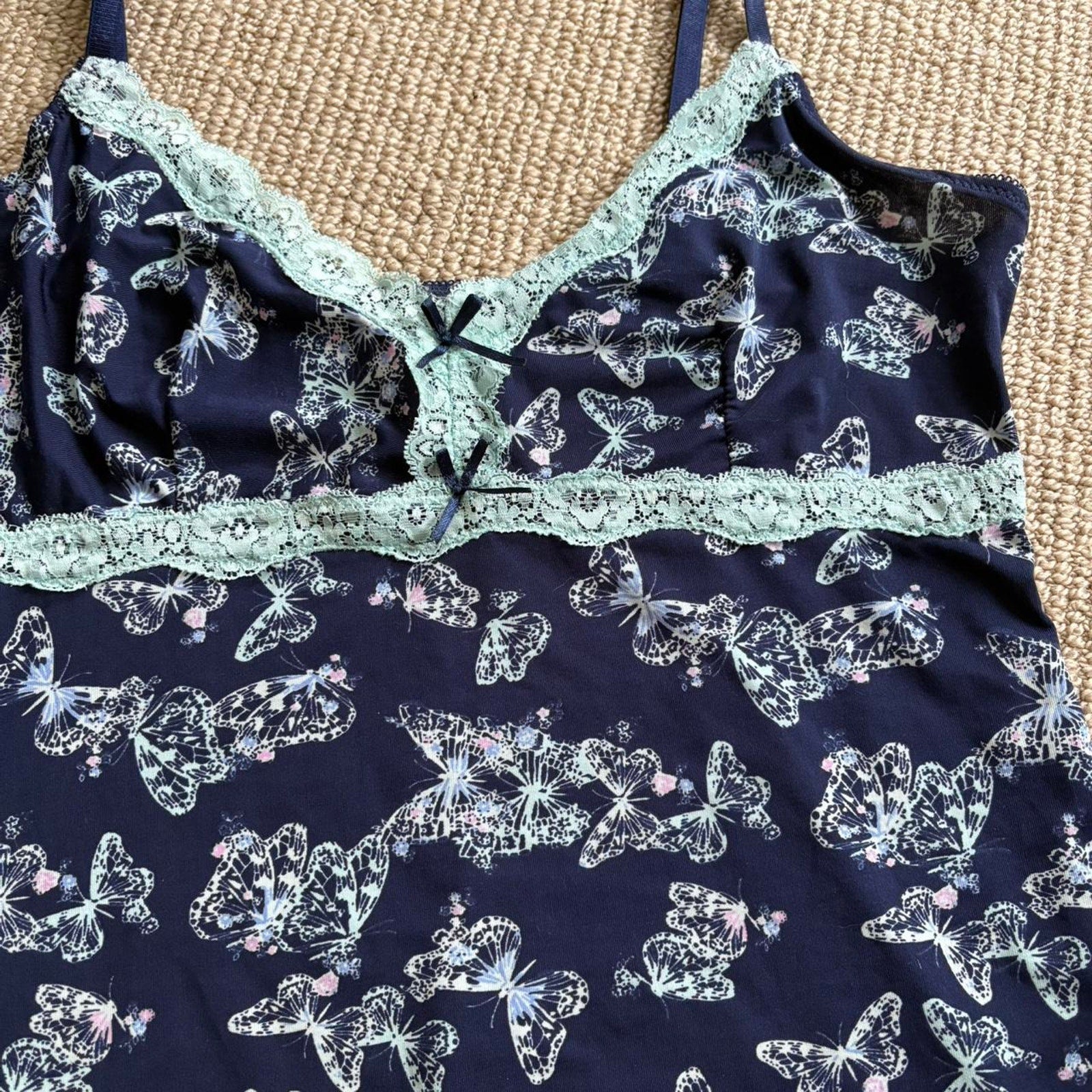 ā navy blue butterfly print lingerie/ sleep style tank top. Spaghetti straps, super stretchy material, and lace detailing.