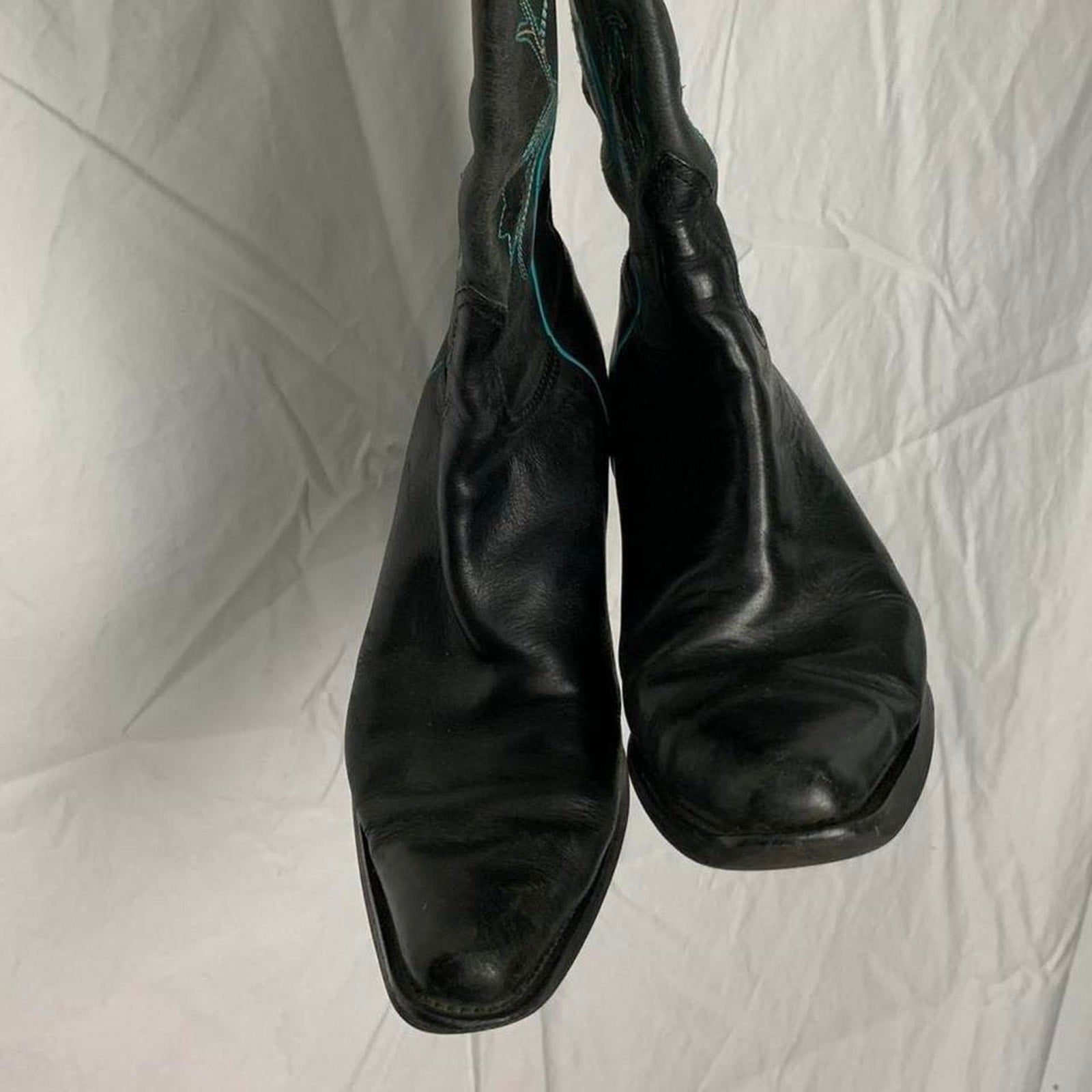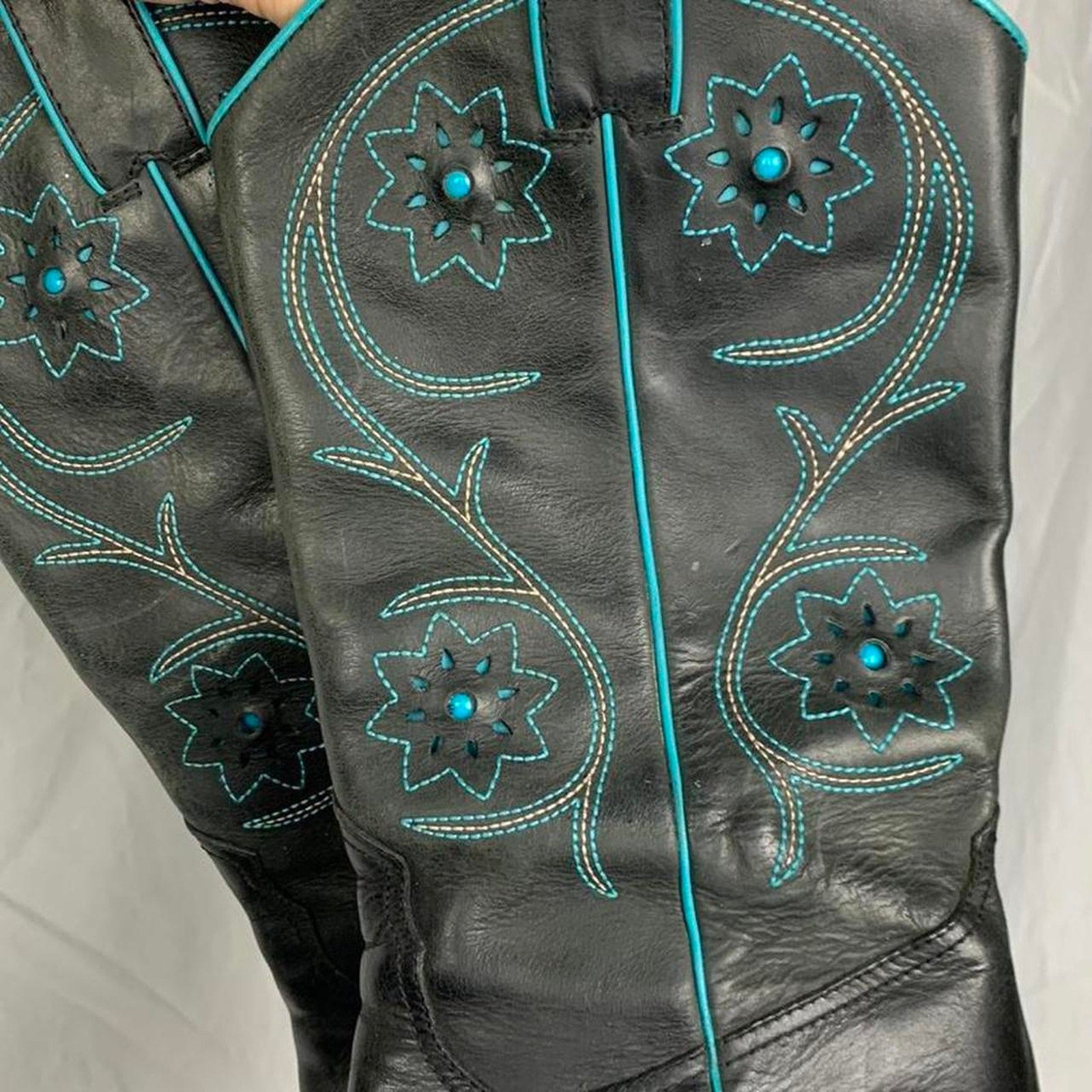 ♡ Black leather cowboy boots with turquoise detailing. Floral details with colored stitching and embroidery. Pointed toe and short heel.
