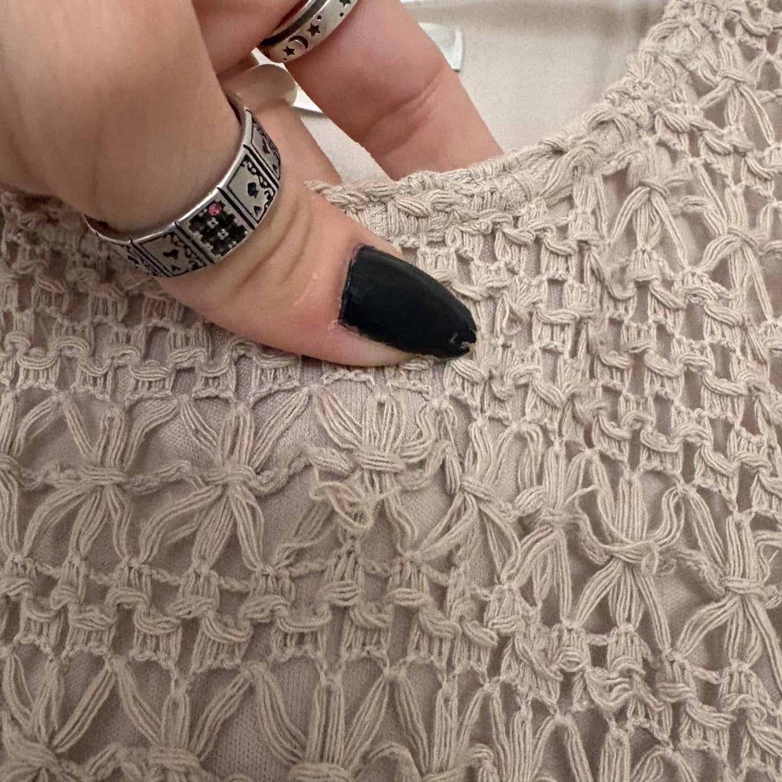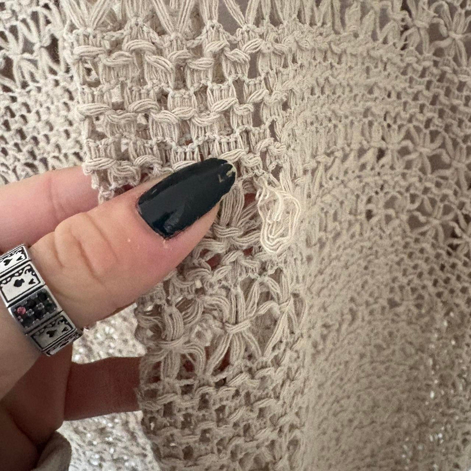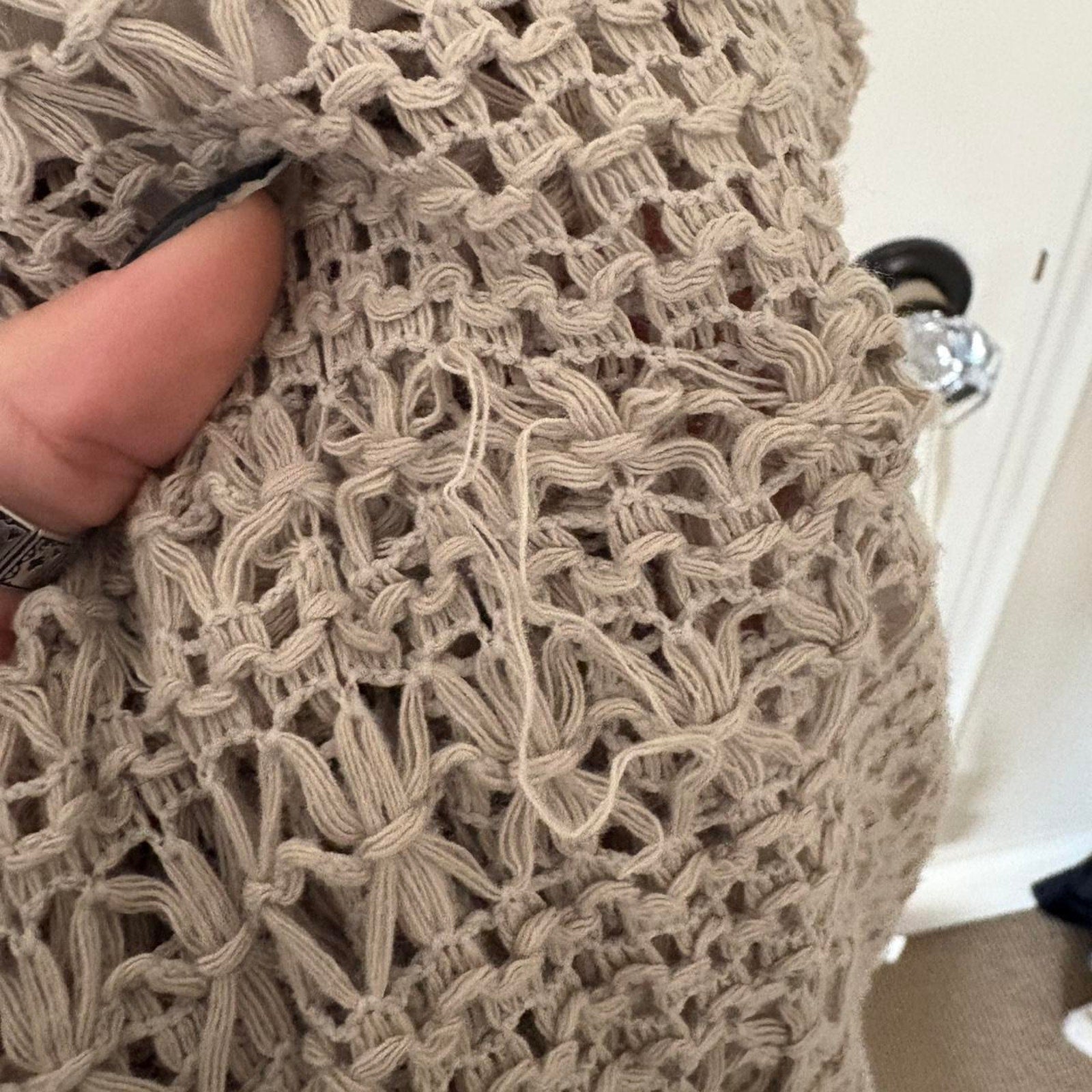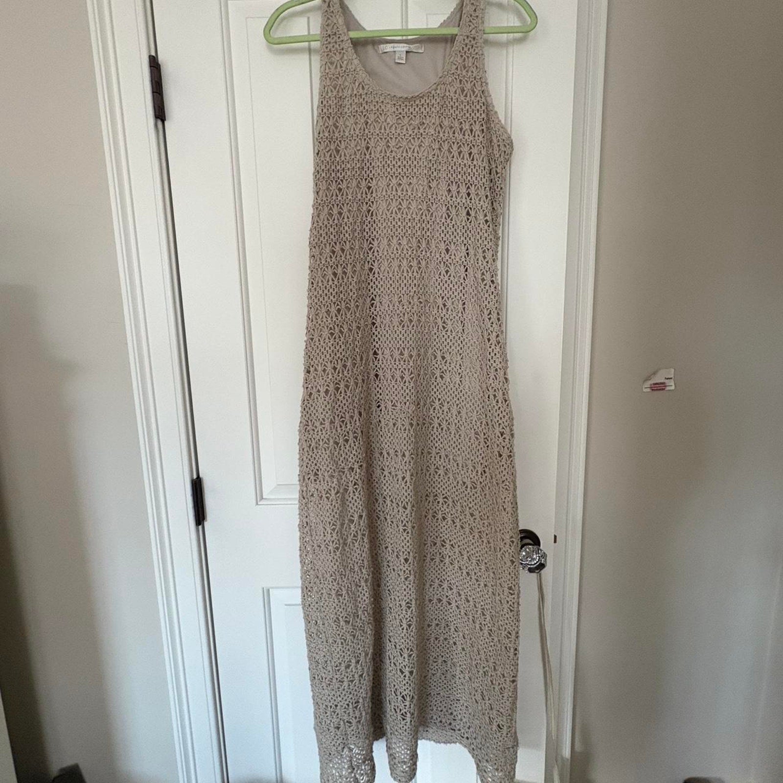 ā cream crochet or knit style overlay maxi dress. Double lined until you get around the thigh, see-through from there on.