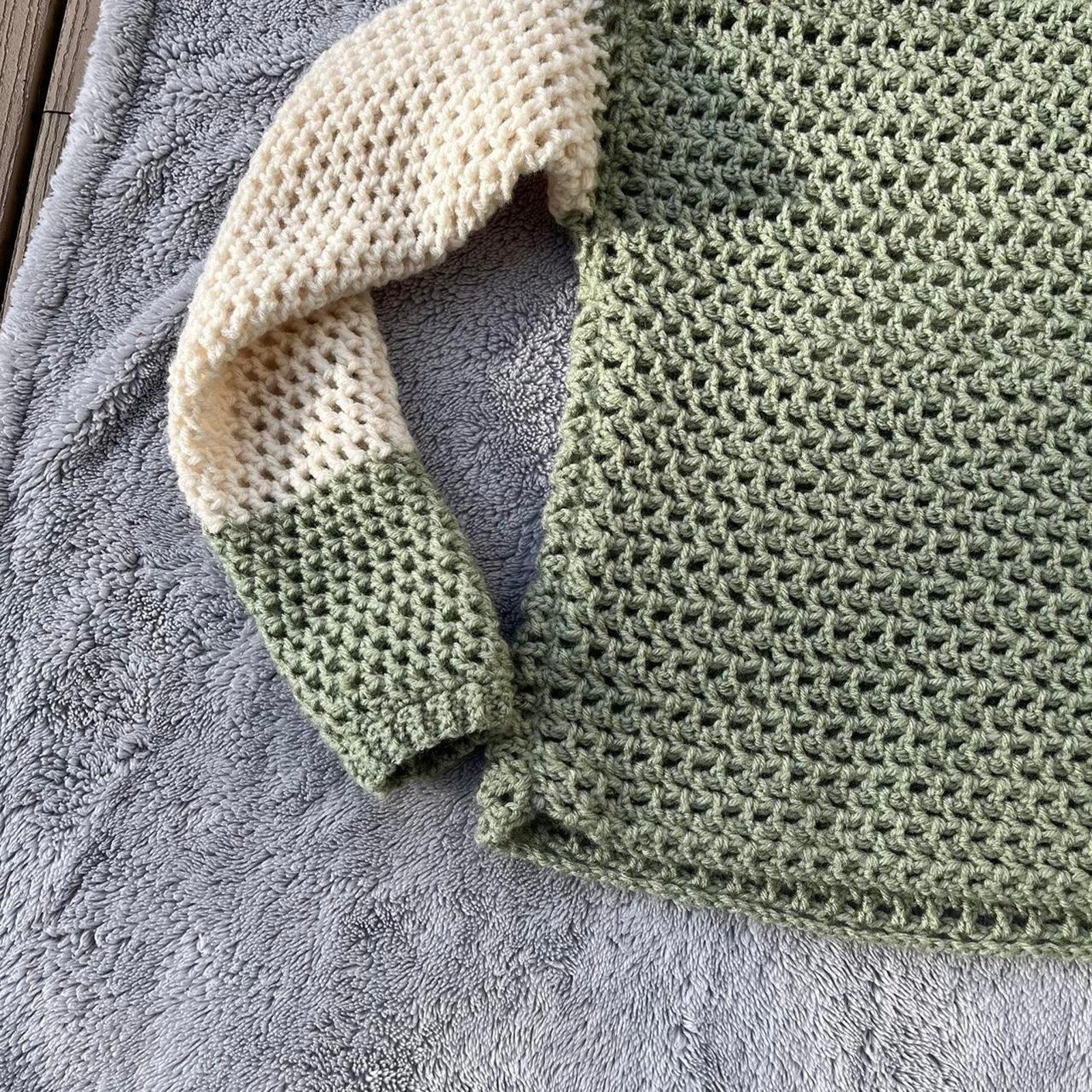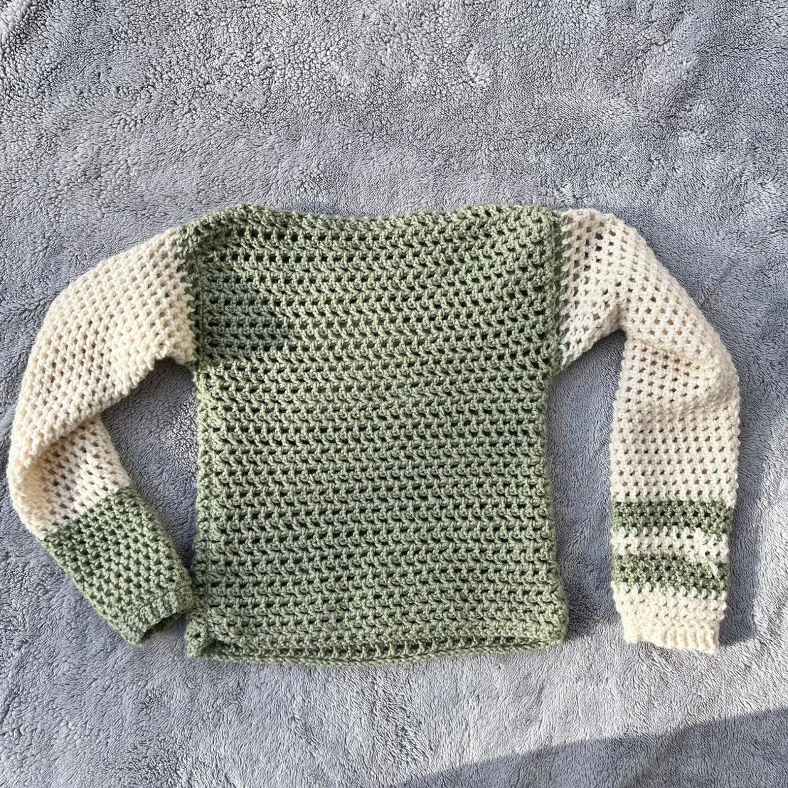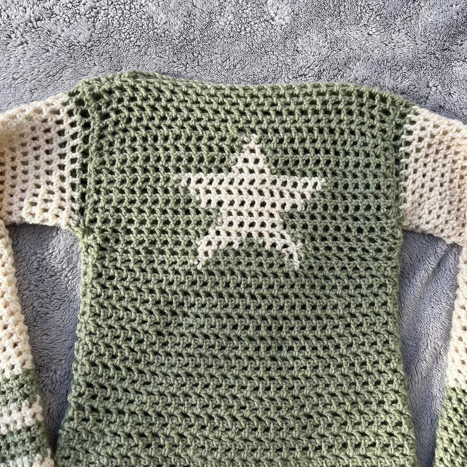♡ Hand-crocheted long-sleeve top. Cream and sage green yarn with asymmetrical striped sleeves and star detail.