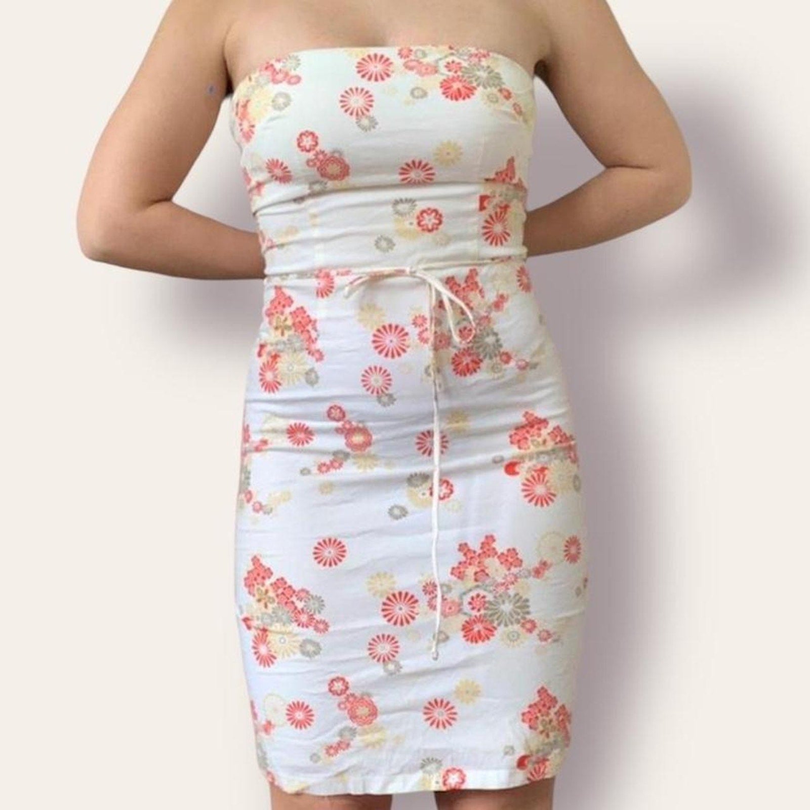 ♡ white, red and yellow/ brown floral patterned dress. Bodycon fit with tube style strapless top. Waist tie and back zipper. Little to no stretch in the material.