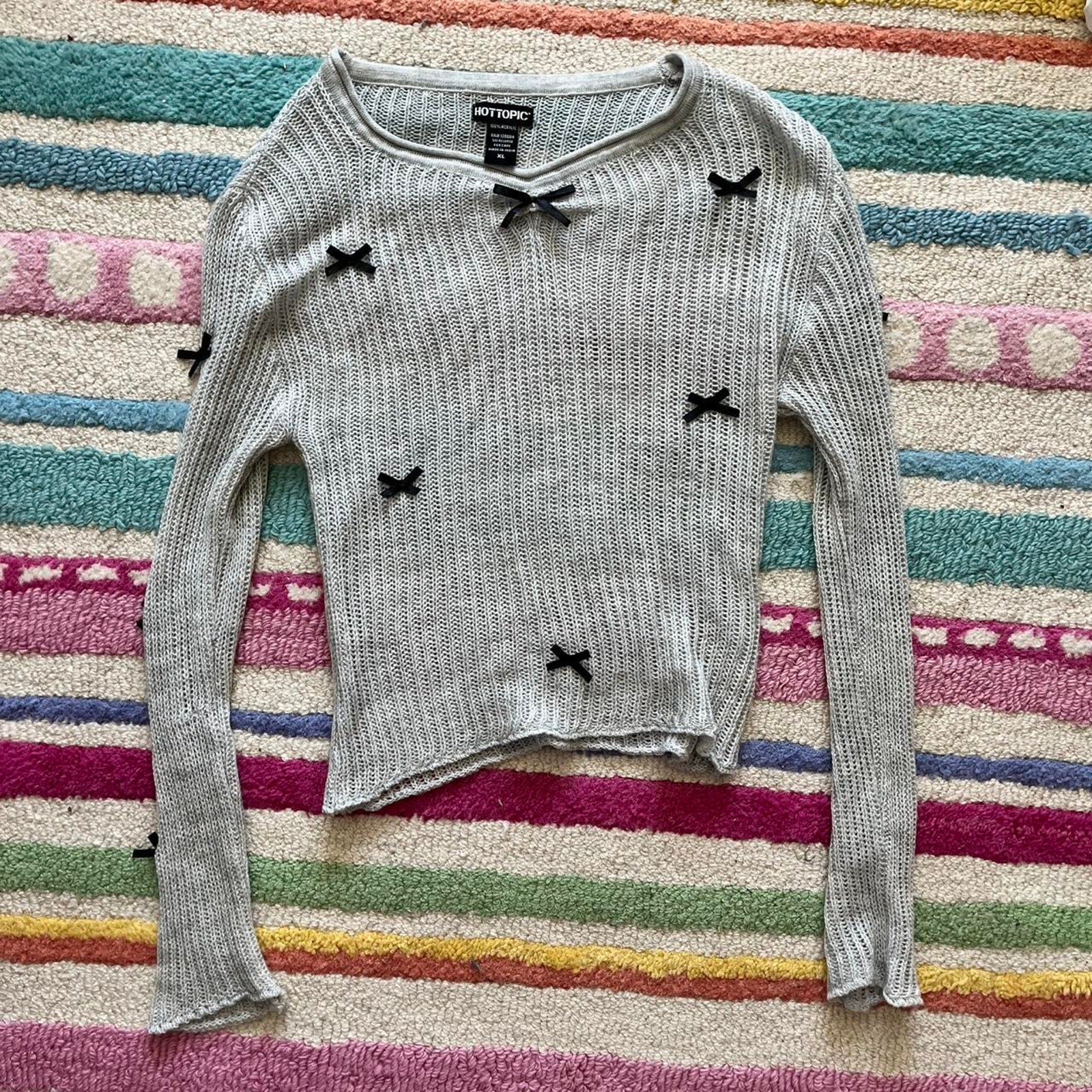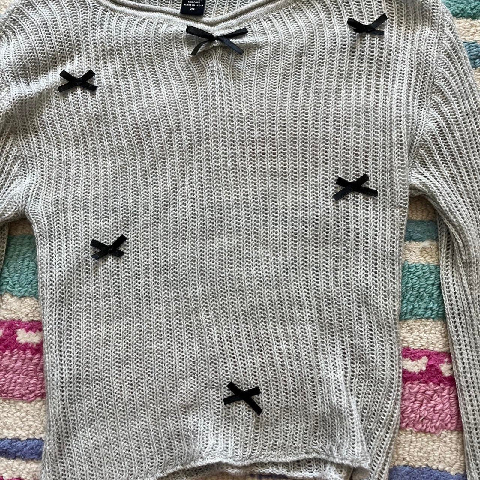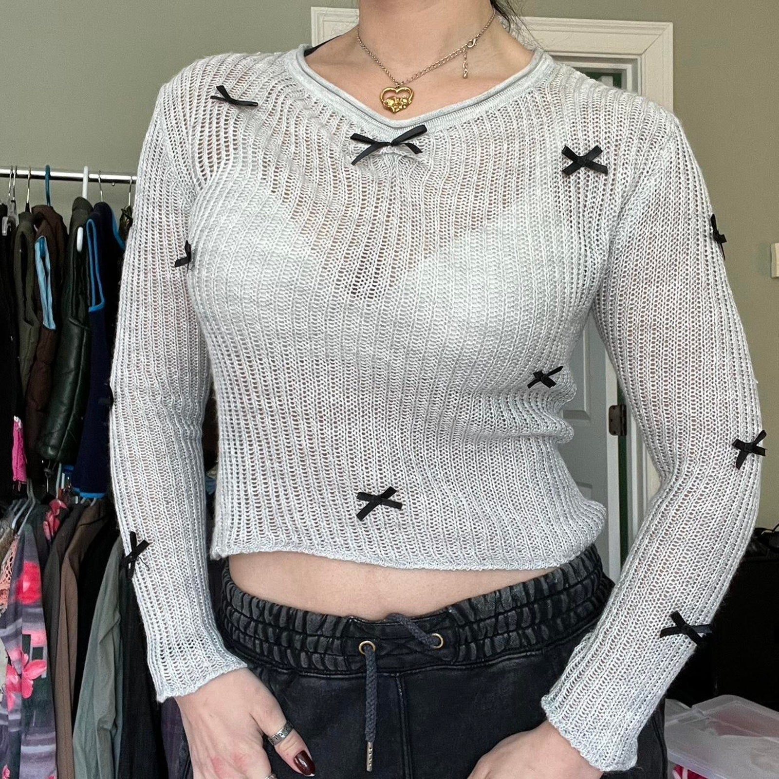 ♡Grey knit long sleeve with black bow details and v neck. See through style.