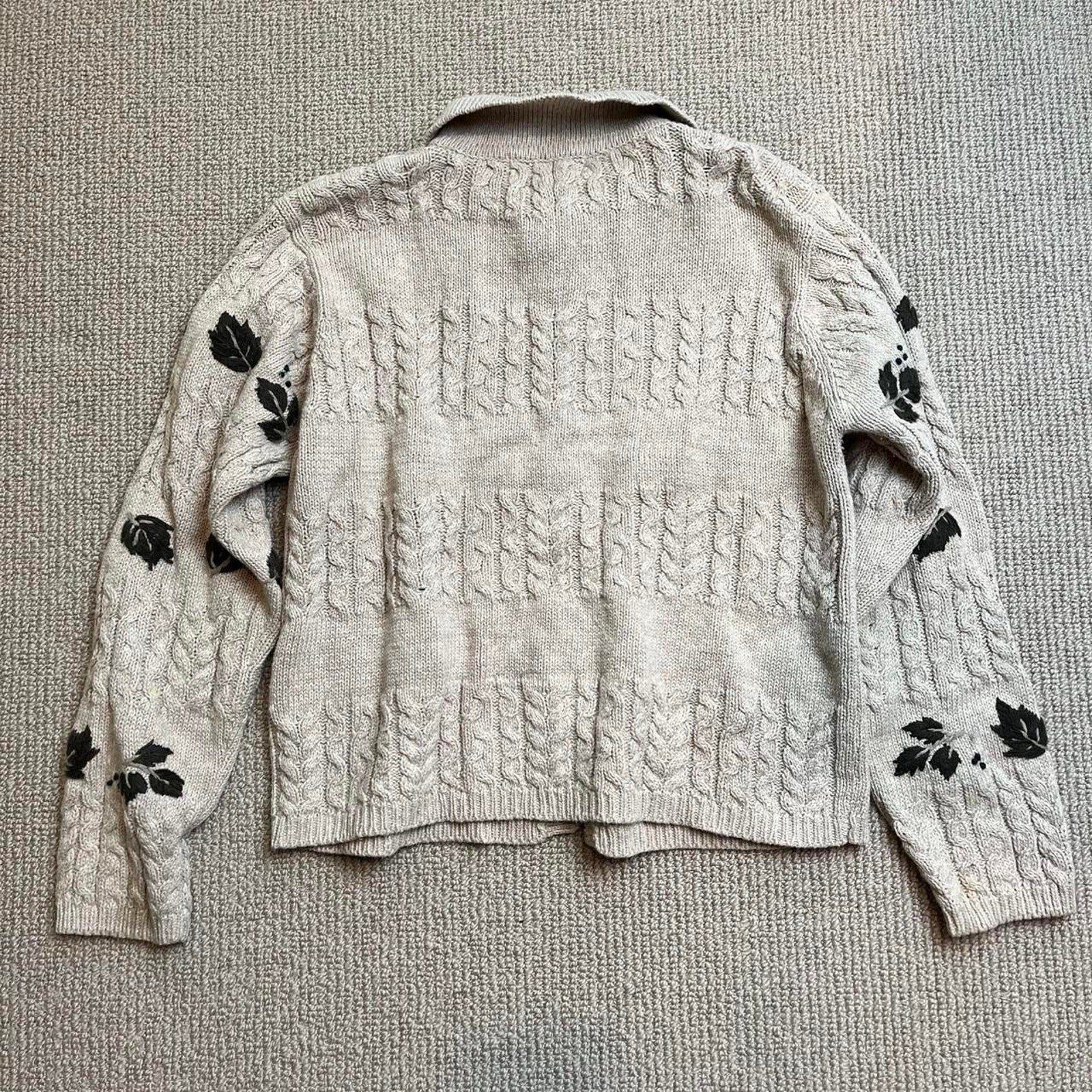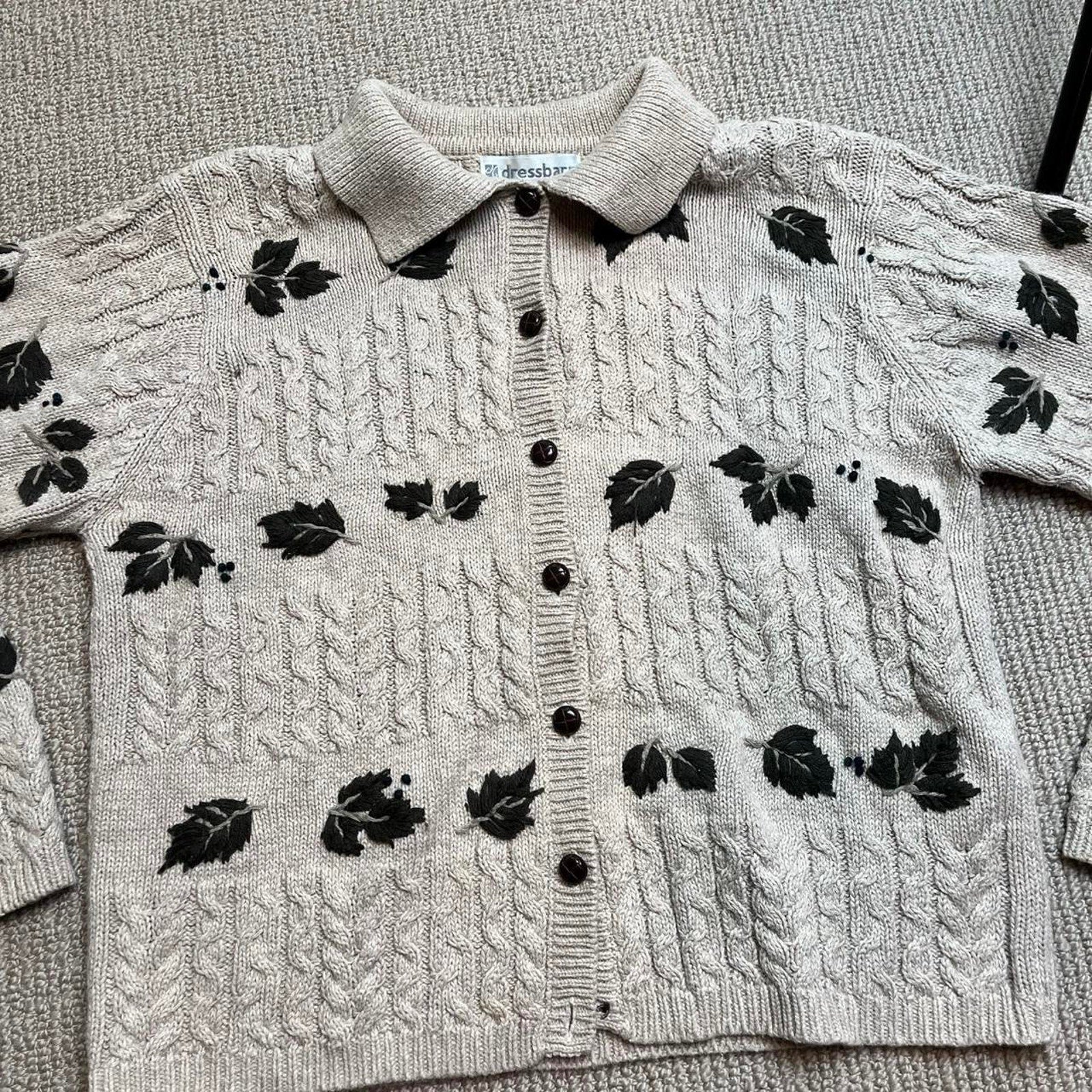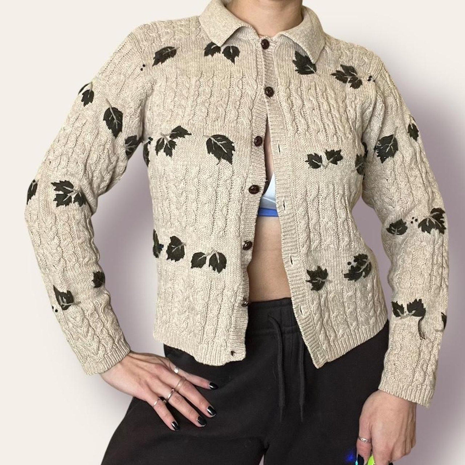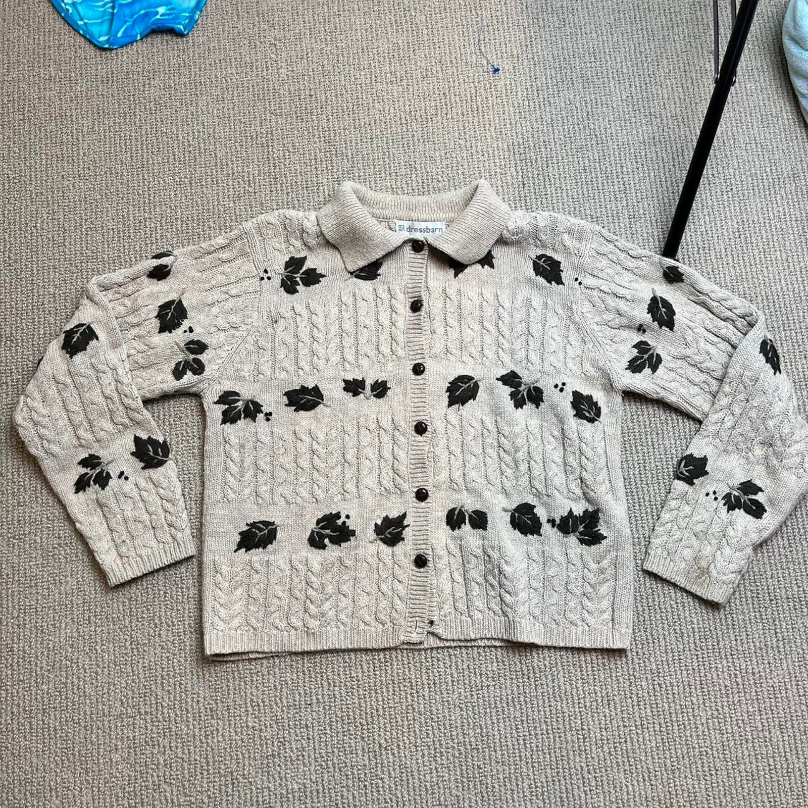 ✭ cream and brown cord cardigan. Embroidered leaf print and button closure.