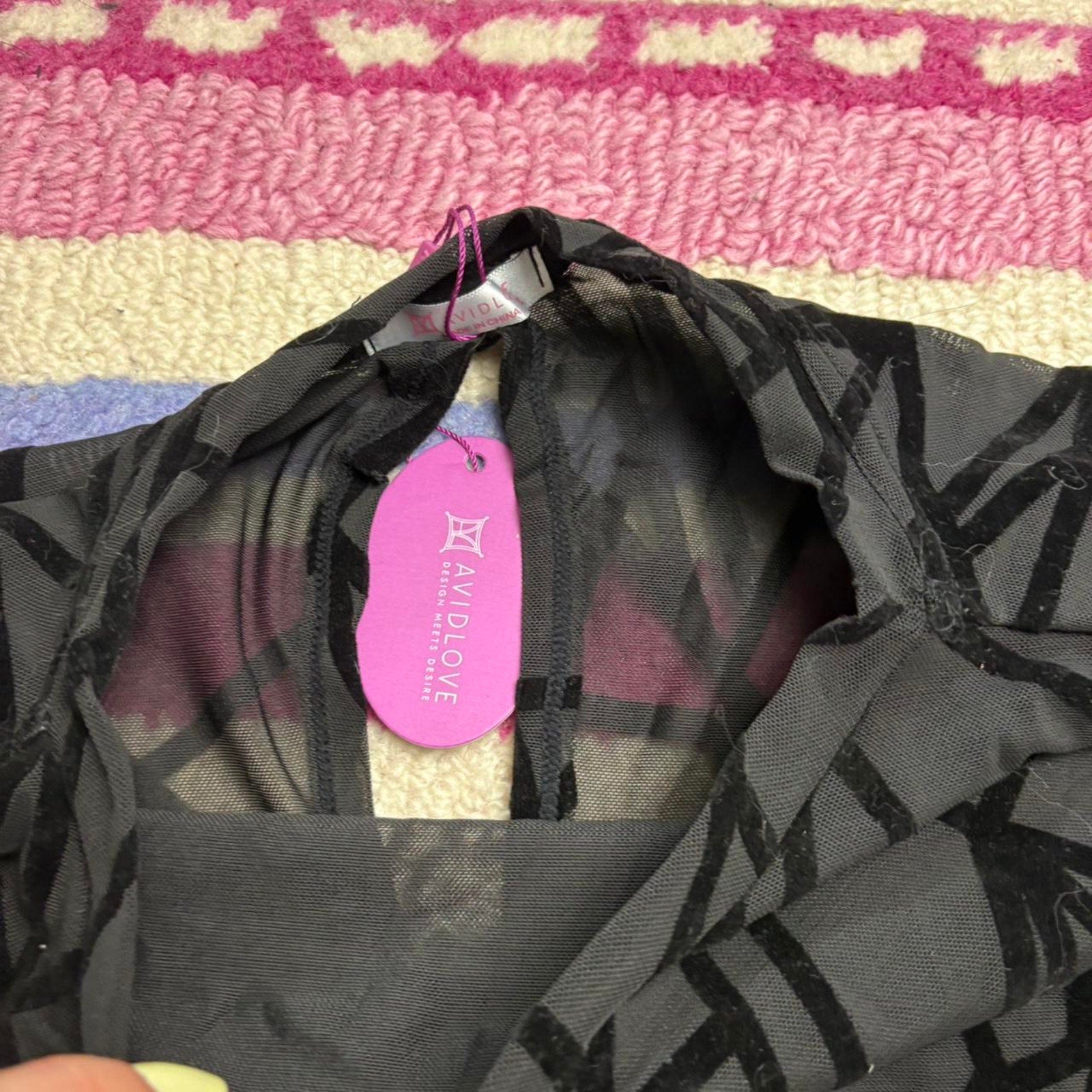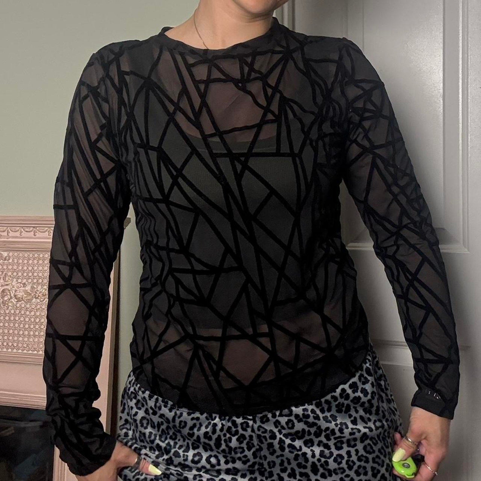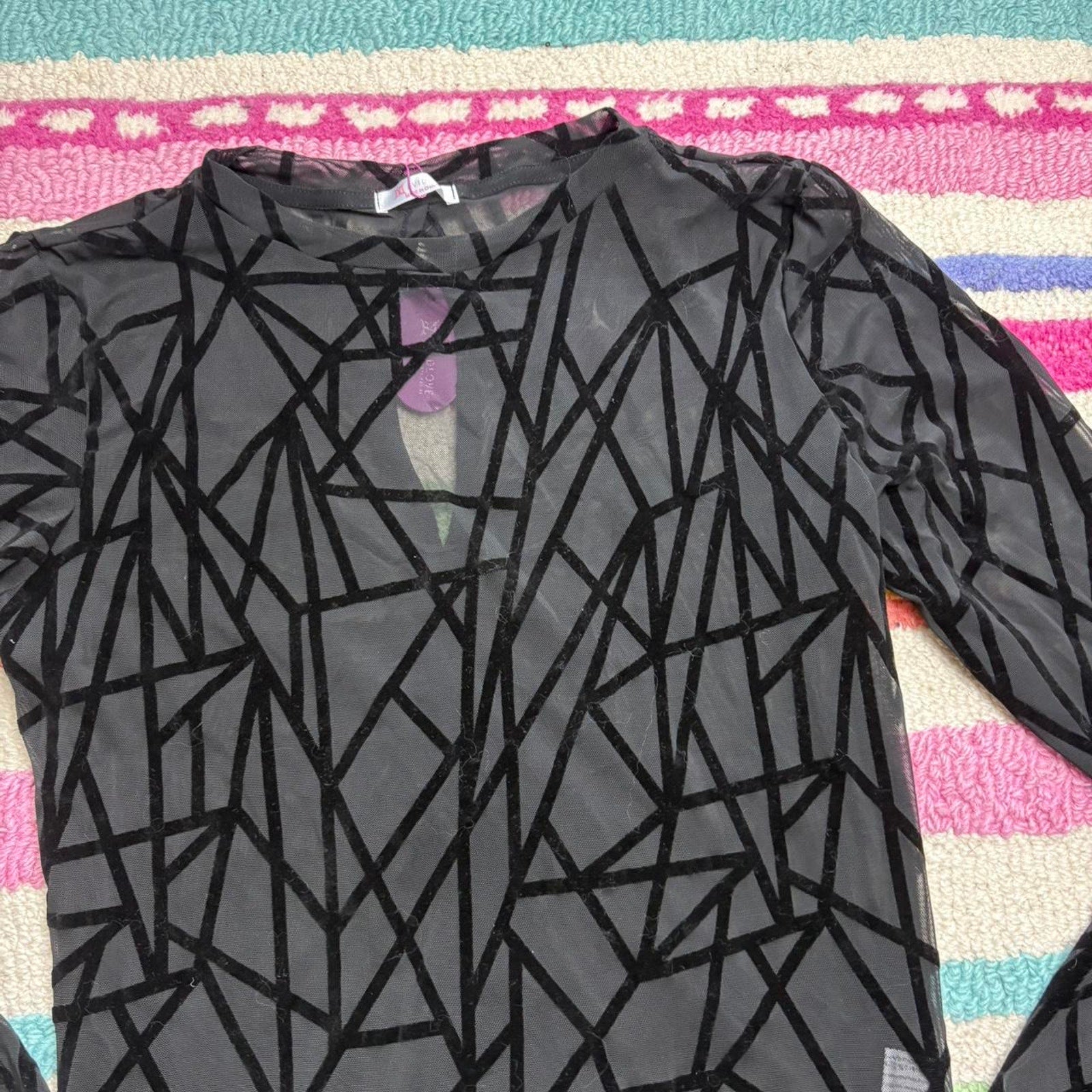 ā NWT black mesh geometric style long sleeve. Cinched back with tie and open detail.