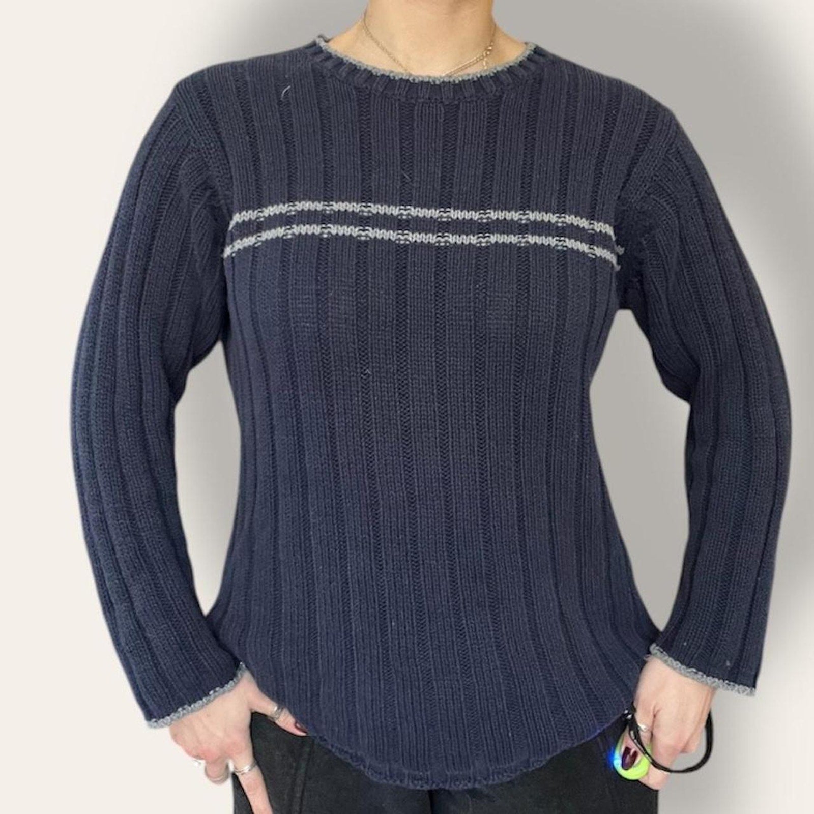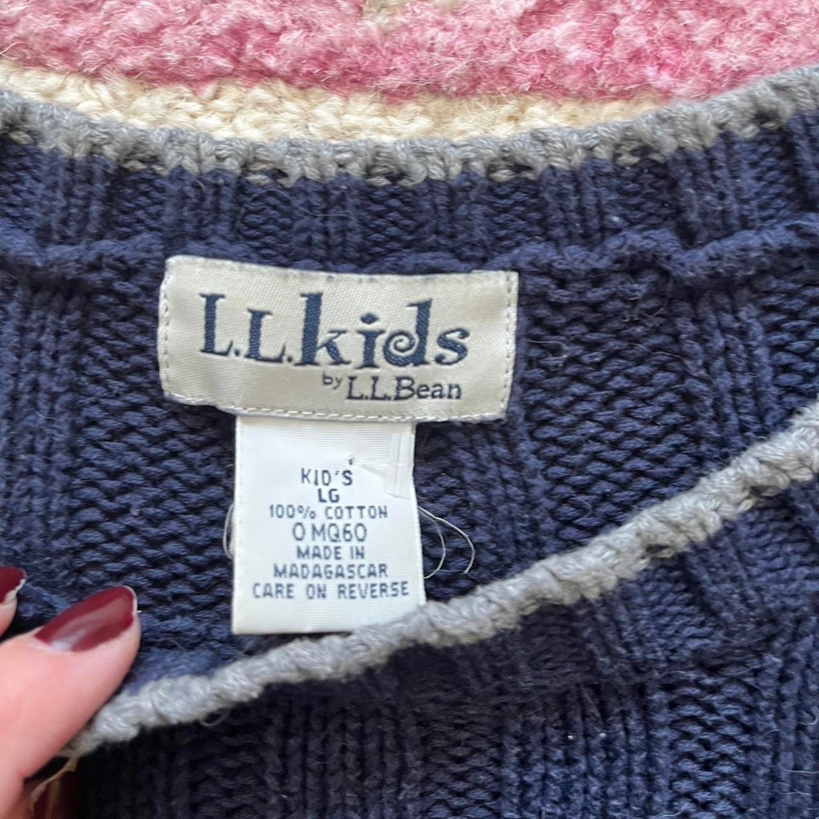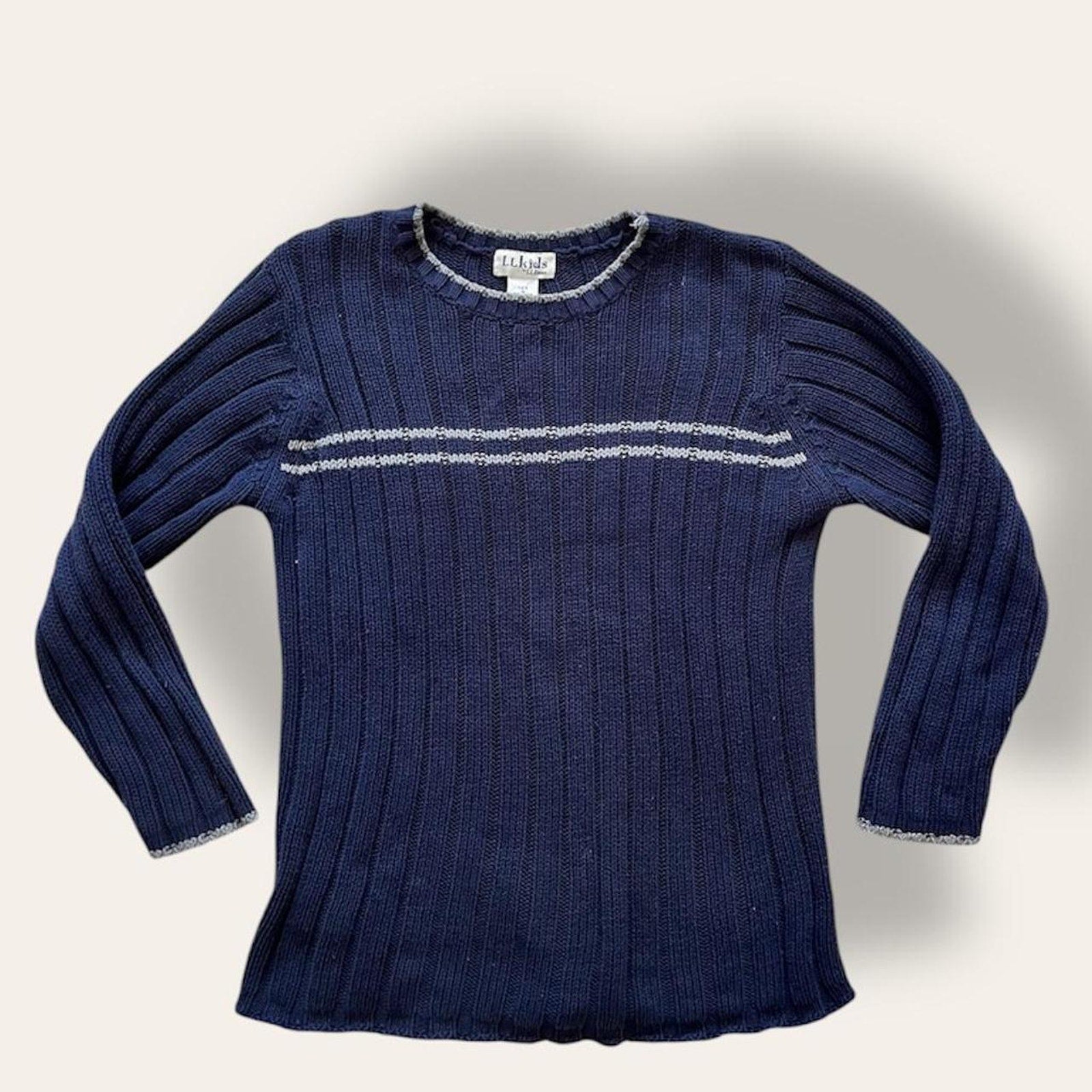 â Navy blue knit sweater. Grey striped details on neck and across chest. Kids large fits like a womenâs M. Marking this item as a womenâs M because it truly fits like an adult sweater.