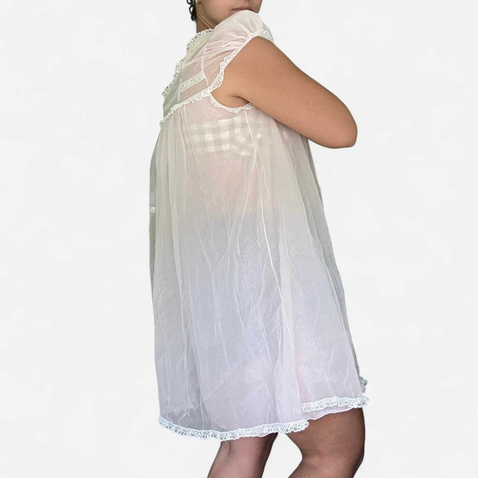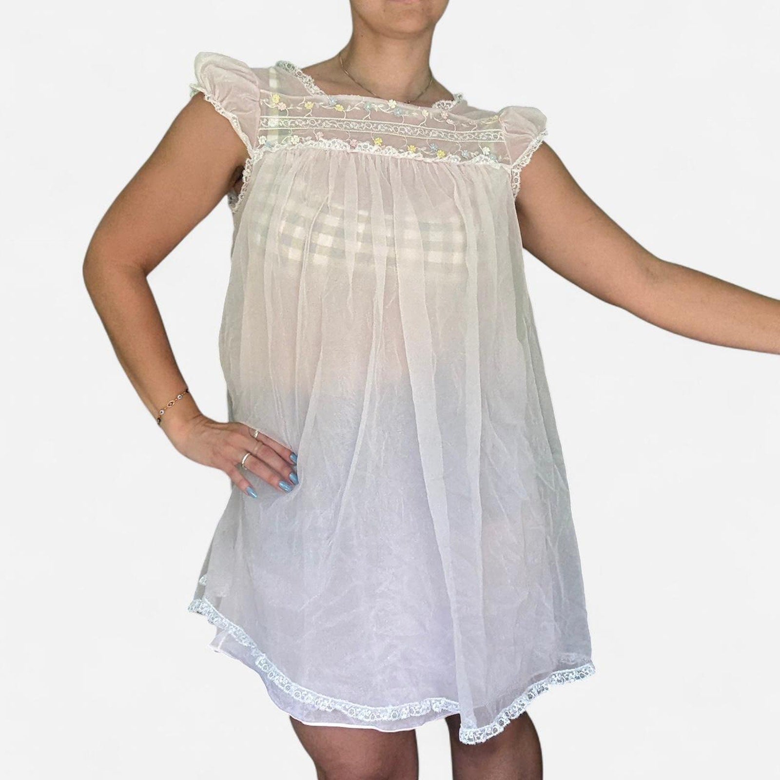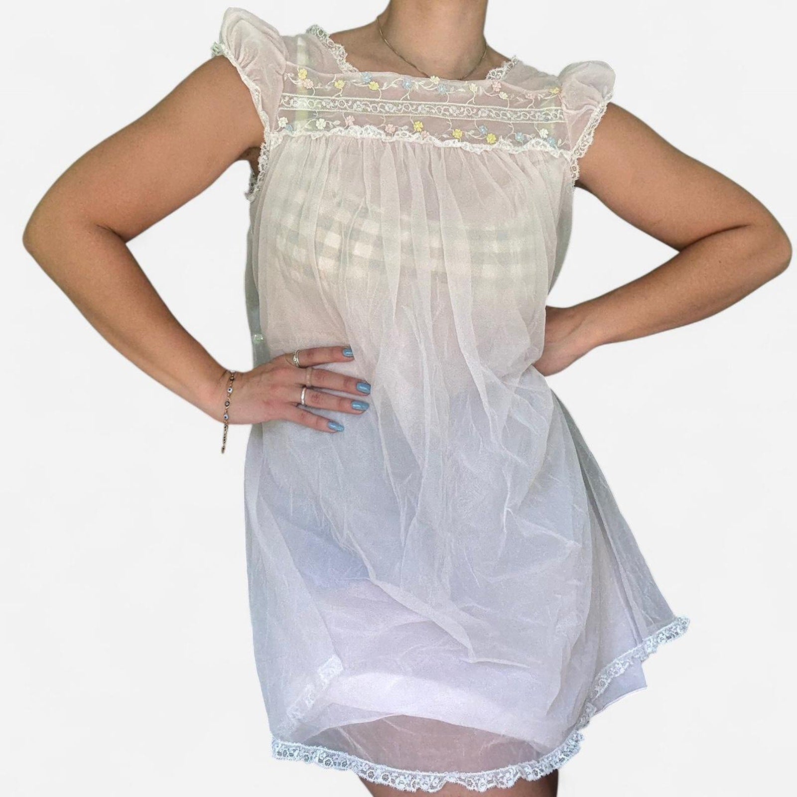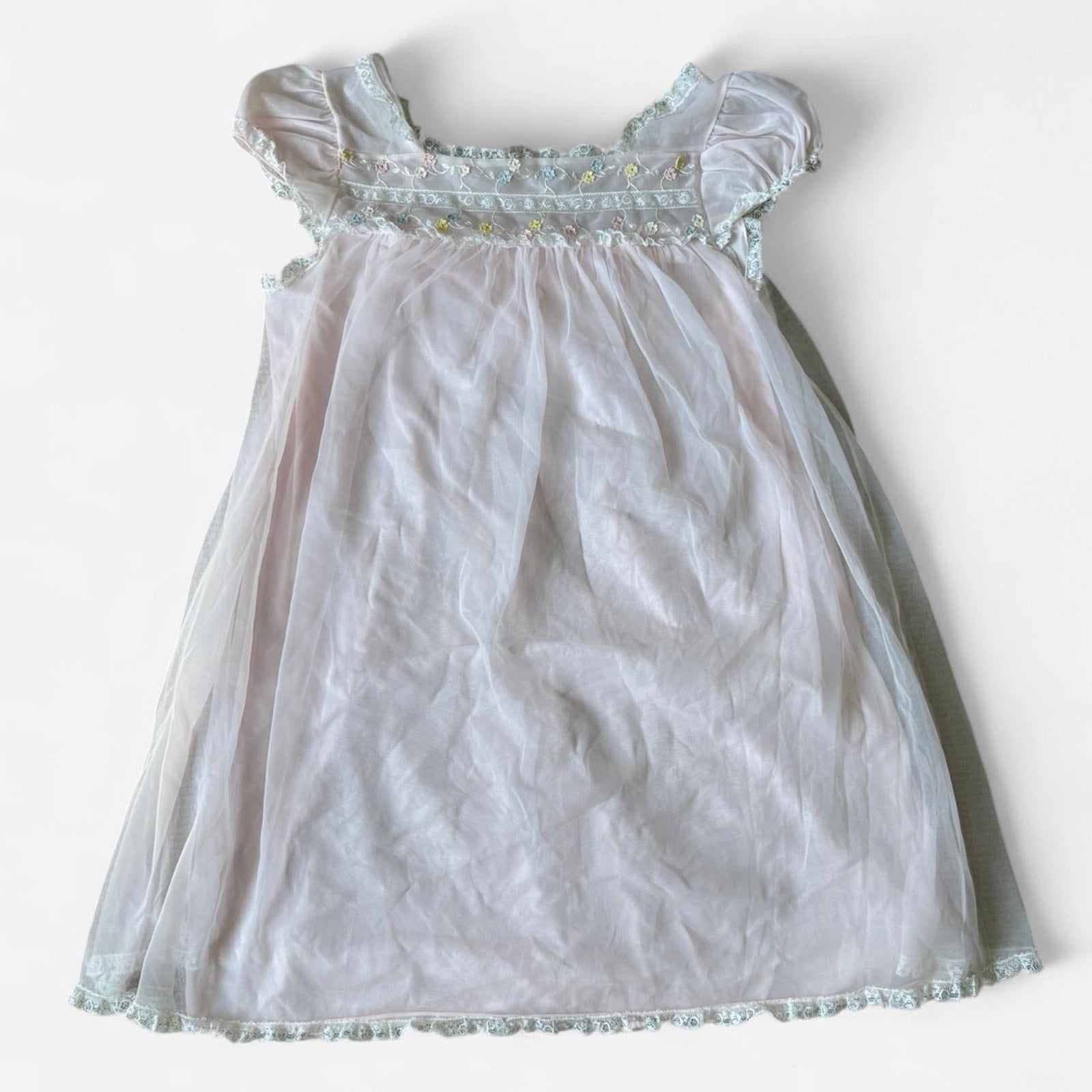 ✭ Light pink babydoll nighgown mini dress. Blue, pink, white and yellow floral details at the chest and flutter sleeves. See through layers.
