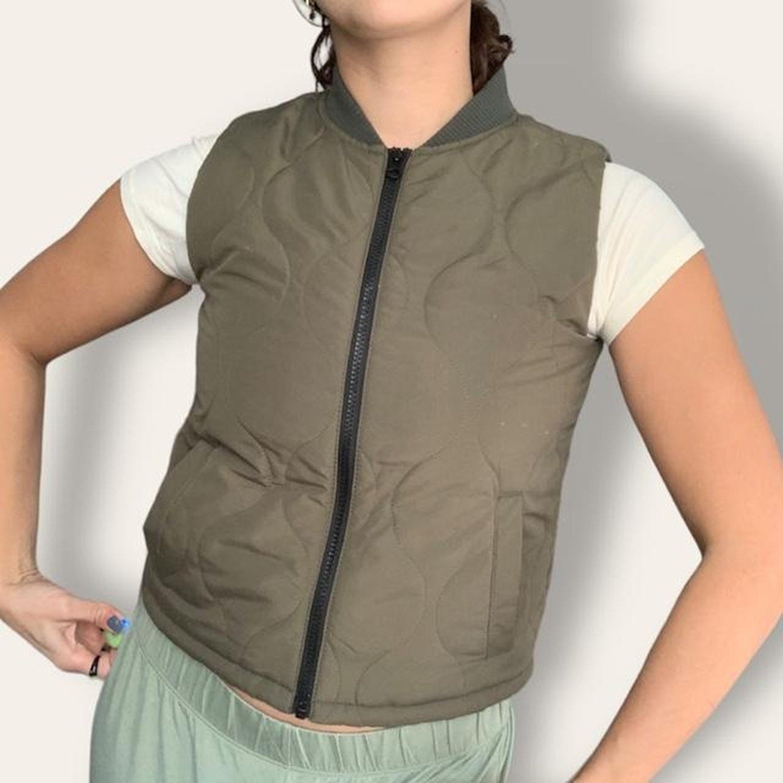 ♡ olive green quilted zip up puffer vest. Kids size so fits tight/ a bit cropped.