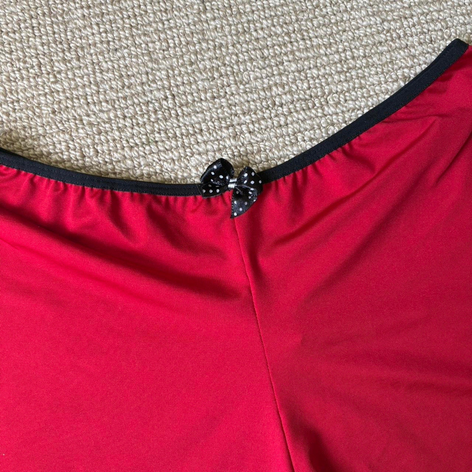 ā Red stretchy micro mini shorts. Black trim waist with polka dot bow detail.