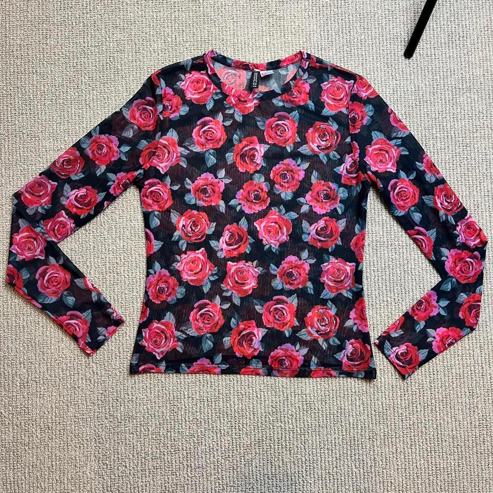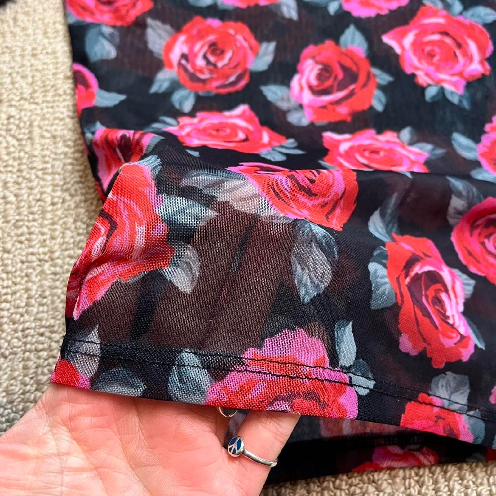 ā Pink red and black rose print mesh long sleeve. Stretchy material.