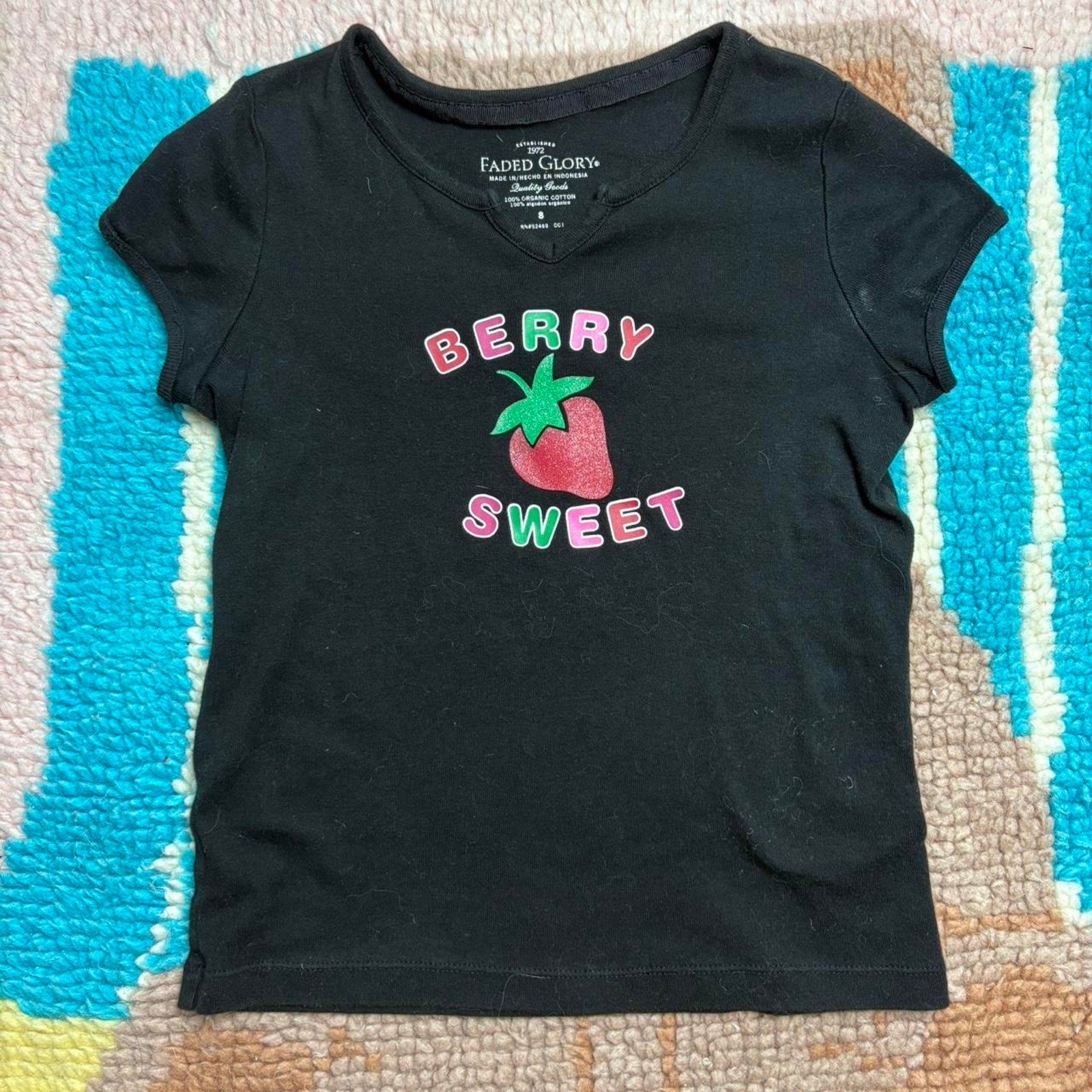 â black baby tee with strawberry âberry sweetâ design. Slight v neck.