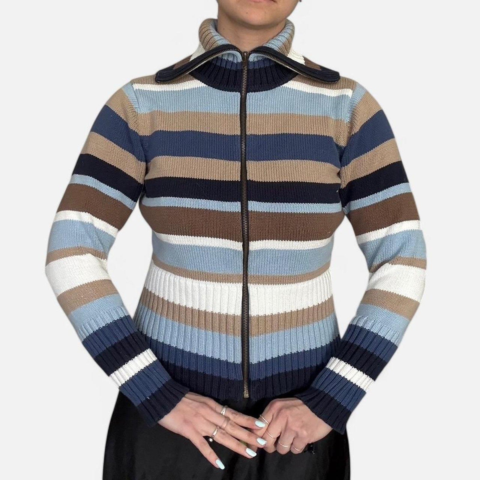 ✭ blue white and brown striped knit sweater. Zip up with foldable turtle neck.