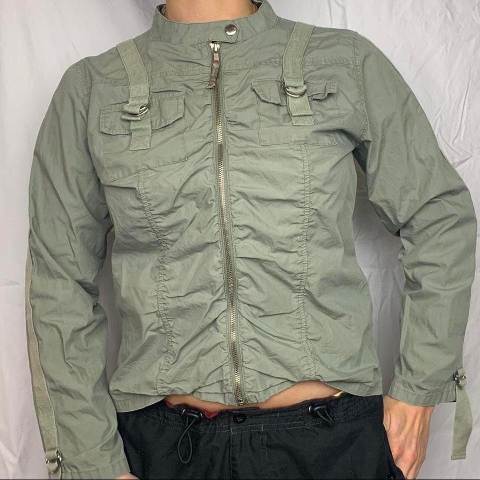 ♡ olive green lightweight zip up jacket. Ruched details and utility style strap pockets and sleeves.